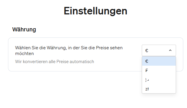 - Klicken Sie auf die aktuelle Währung, um die Liste der verfügbaren Währungen zu öffnen.