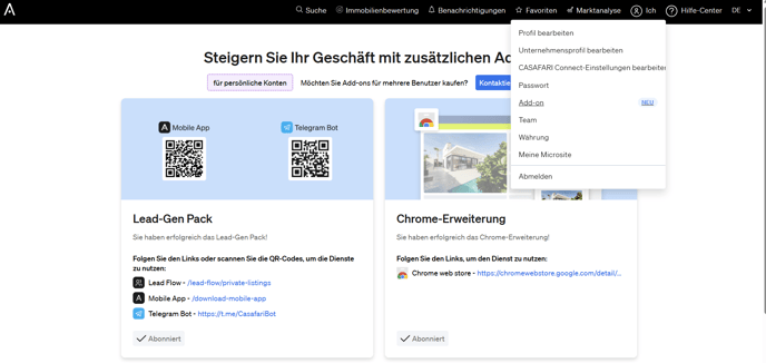 Das Lead Gen Pack ist als Add-on fĂĽr Ihre CASAFARI-Plattform verfĂĽgbar und bietet Zugriff auf private Listings und automatisierte Lead-Kommunikation ĂĽber Telegram-Bots.