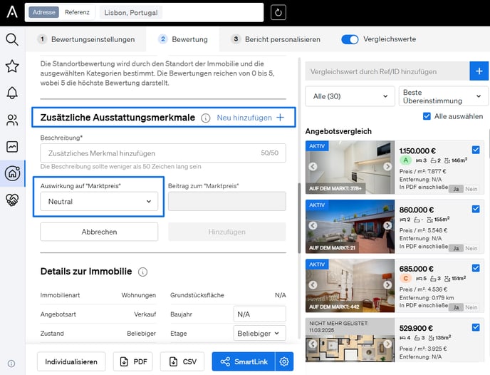 Wenn Ihre Immobilie über eine besondere Eigenschaft verfügt, die ihren Wert beeinflussen könnte – wie etwa Solarmodule, eine renovierte Küche oder Bereiche mit Verbesserungsbedarf wie Sanitär- oder Elektroarbeiten – können Sie diese bei CASAFARI manuell zu Ihrer Bewertung hinzufügen.