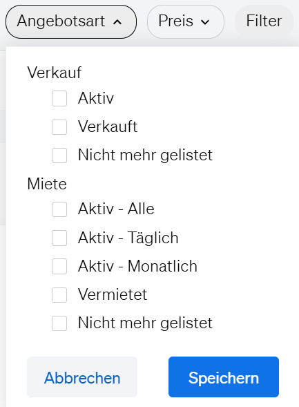 - Klicken Sie auf die Filter, um den Status und die Aktivität auszuwählen, z. B. ob das Objekt vermietet oder verkauft wird, ob es verkauft wurde, noch aktiv ist oder aus dem Angebot genommen wurde.