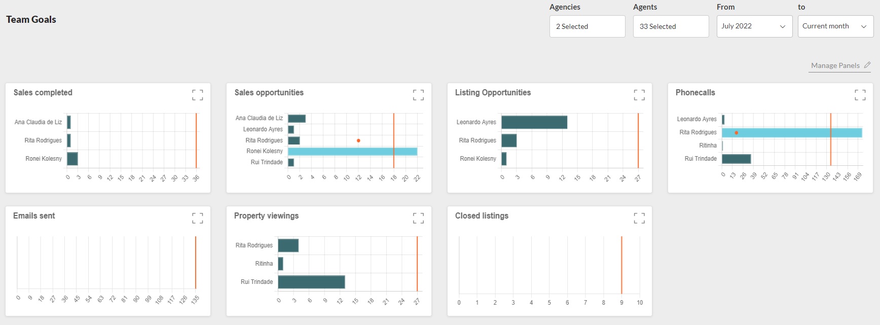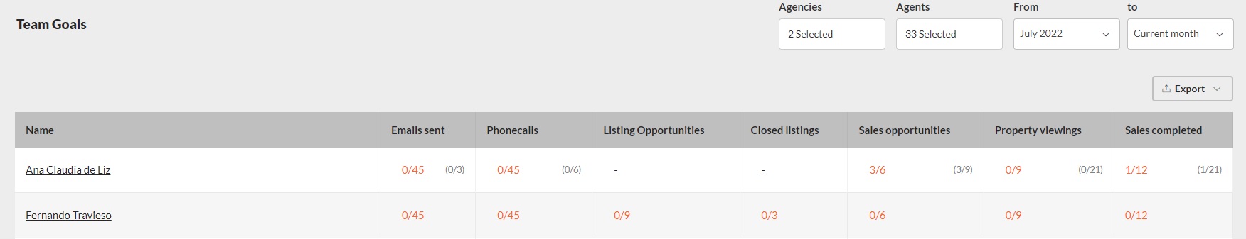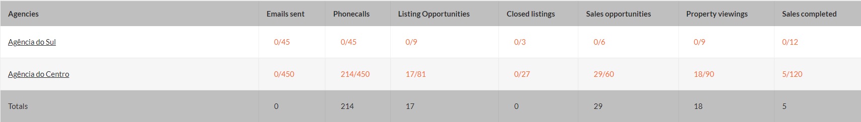 In this table, if the agent has set some personal goals, each column also shows in grey the current state of that goal compared to what was set as a personal goal.