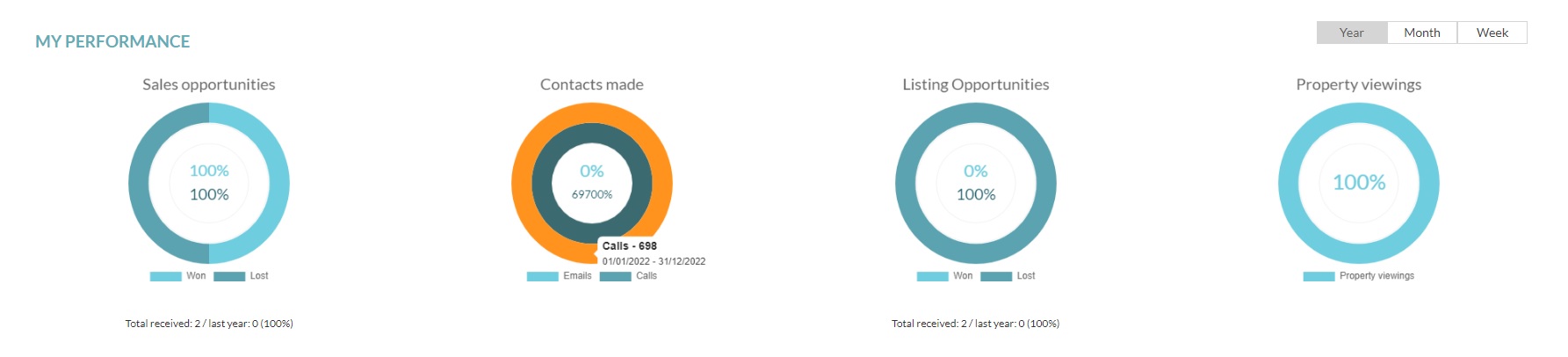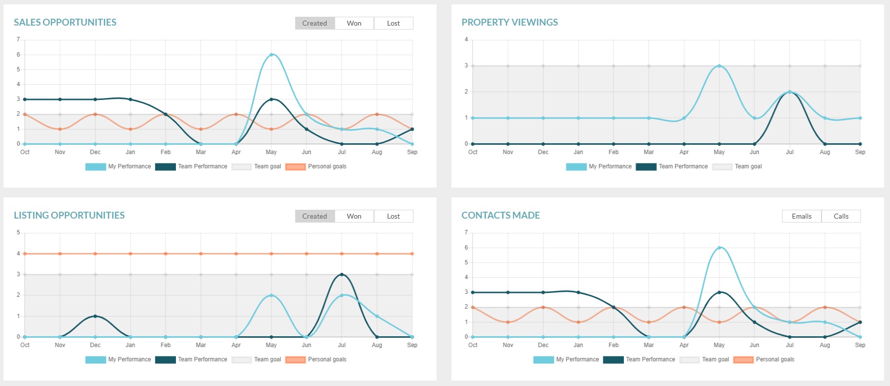 Overview of user/team performance and goals on new listing opportunities for the current month and last 11 months. Filter by all won or lost opportunities.