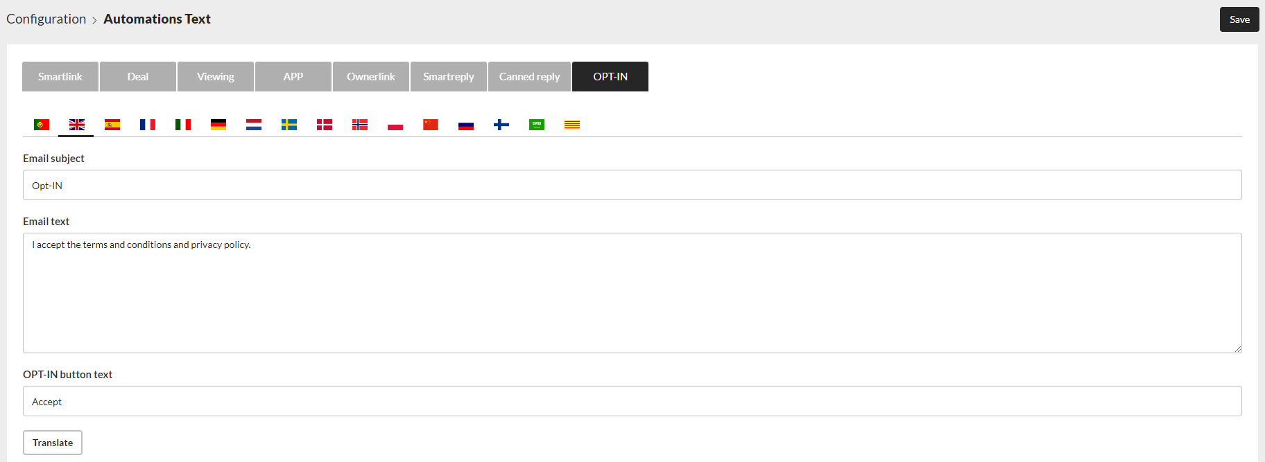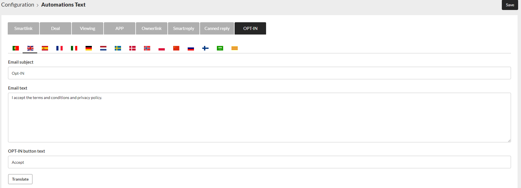 Note: On leads generated on the website, the OPT-IN option will already appear enabled, because when the potential buyer makes a contact request, he/she has to accept the terms and conditions.