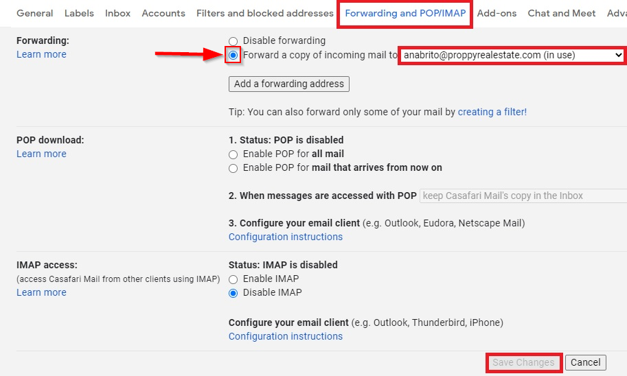 4. You will receive a confirmation code which you must configure in Gmail (Settings - View all settings - Forwarding and POP/IMAP - Forwarding) or click the link to confirm the forwarding of leads.