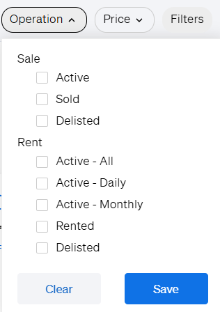 - Click on the filters to select its status and activity, if it's for rent or for sale. If it has been sold, is still active or was delisted.