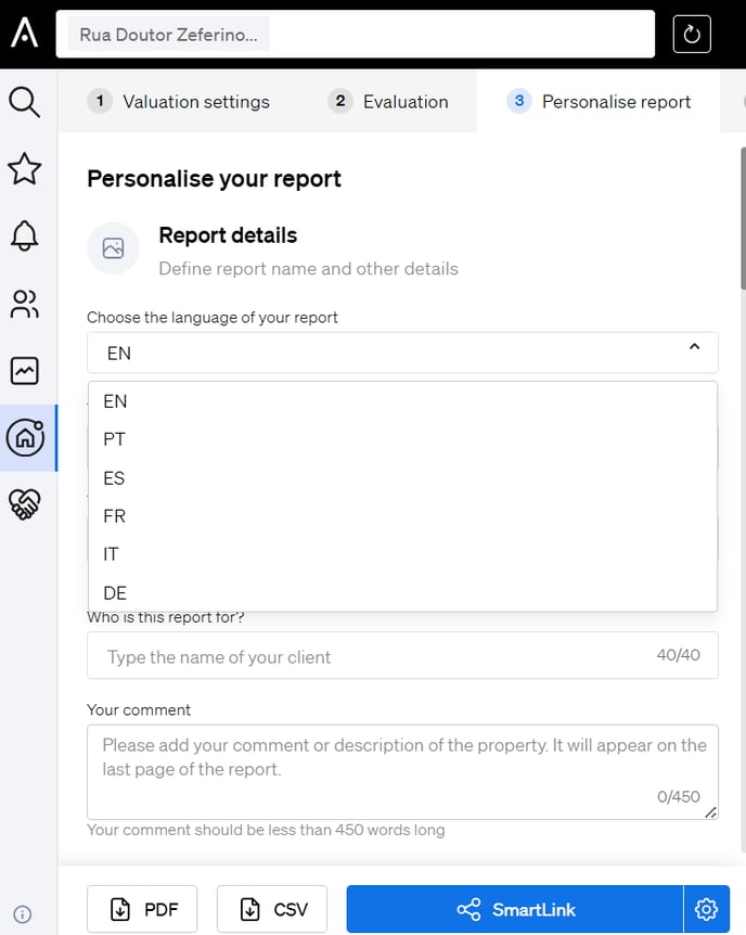 CASAFARI supports multiple languages, including English, French, Portuguese, Spanish, Italian, and German. You can generate reports in any of these languages by adjusting your language settings.