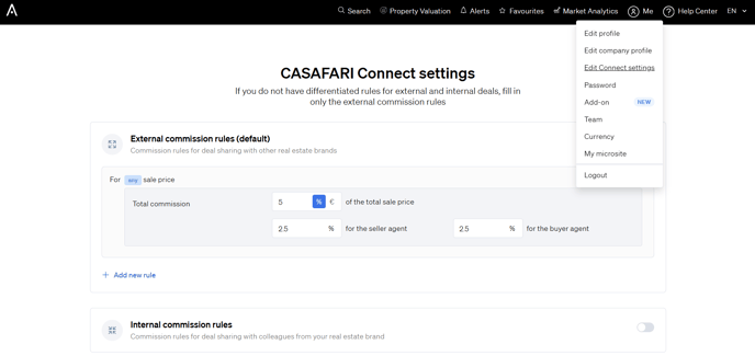 To configure your commission rules in CASAFARI Connect, follow the steps below: