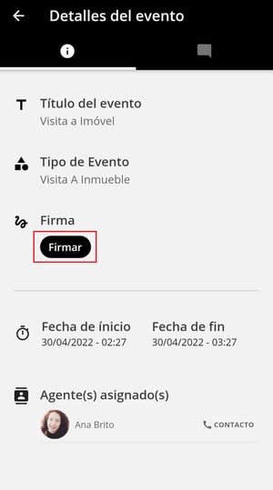 3. Cuando el tipo de evento sea “Visita a la propiedad”, haz clic en “Firmar” para obtener la firma digital del cliente potencial. En el área de propiedades, haz clic en “Comentarios” y escribe comentarios sobre la visita, con la posibilidad de enviarlos al dueño de la propiedad.