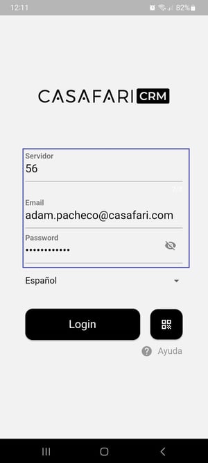 Abre la APP y rellena tu correo electrónico y la contraseña. A continuación, introduce el ID de servidor de tu agencia. Esta información también puede encontrarse en el área de Datos Generales, en la pestaña "APP", en el CRM.