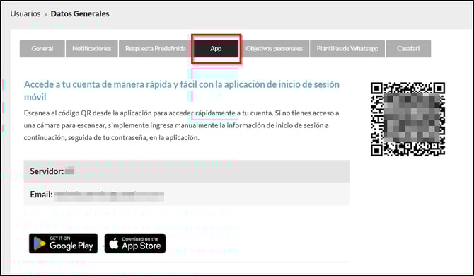 3. En la pestaña "APP” aparecerán dos opciones para iniciar sesión: