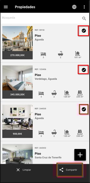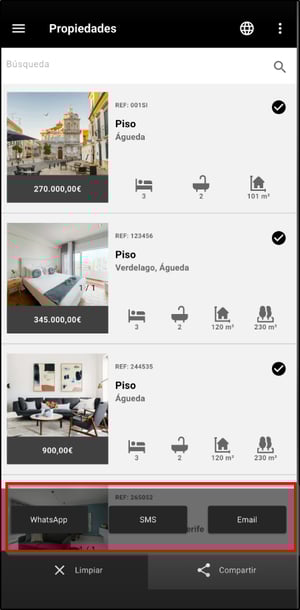 3. Cree y envíe un Smartlink desde la lista de propiedades: seleccione una o más propiedades, haga clic en Compartir y elija el medio con el que desea compartir el enlace; luego seleccione el contacto y envíelo: