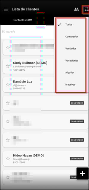 1. Busca por clientes, utilizando los filtros o la barra de búsqueda libre. Filtra por tipo de cliente o interés: Comprador, Vendedor, Vacaciones, Alquiler y Inactivas.