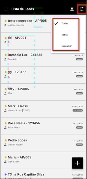 1. Busca clientes potenciales utilizando los filtros o la barra de búsqueda libre. Puedes filtrar por tipo de cliente potencial: venta o captación.