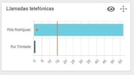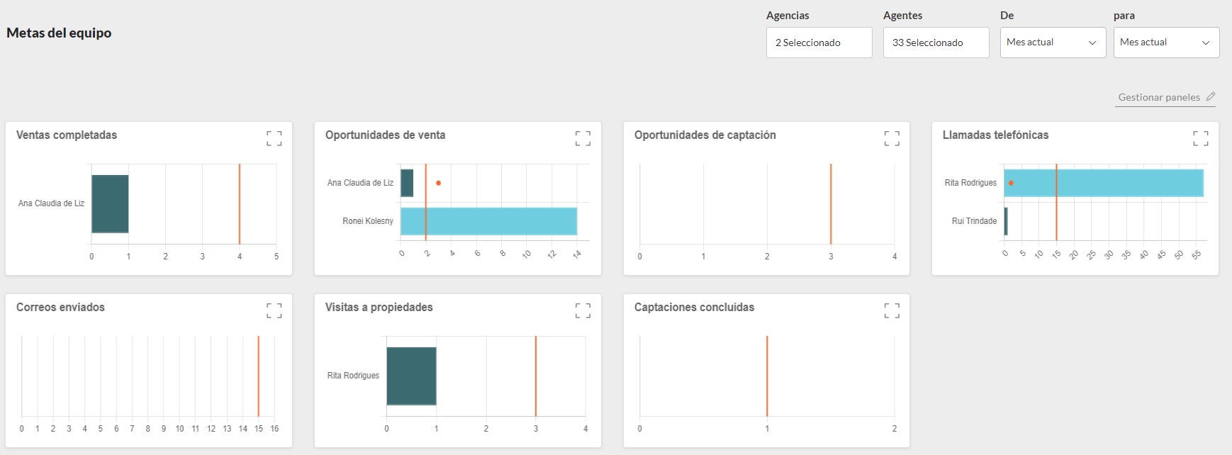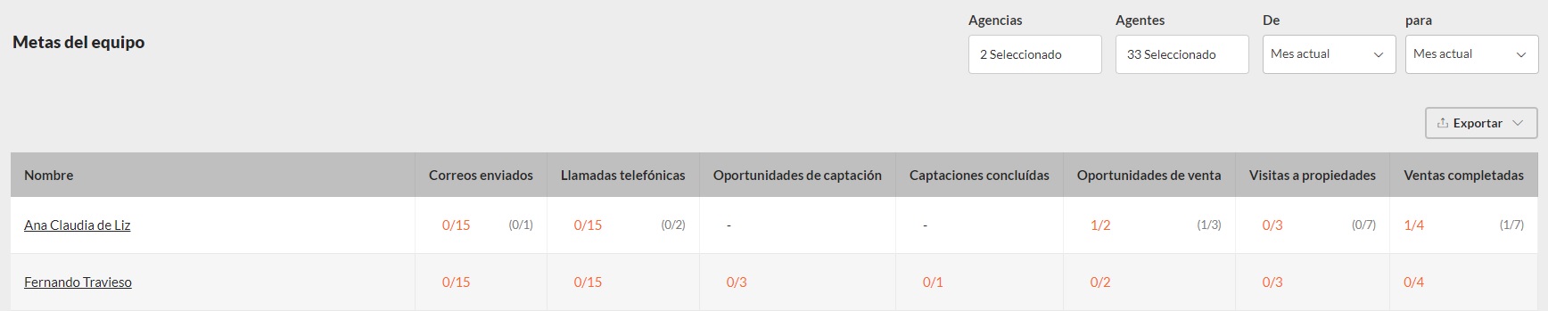Tabla de agentes - muestra todos los agentes de la empresa, el objetivo definido y lo que ya han conseguido en este momento, en color naranja.