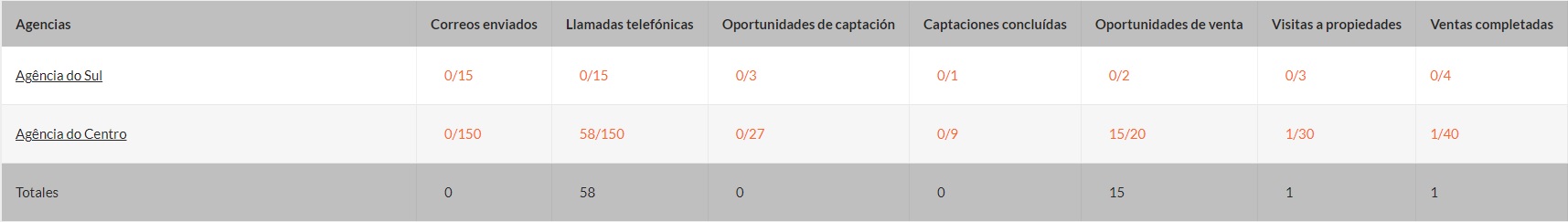 Tabla de objetivos de las agencias: muestra todas las agencias (cada fila corresponde a una agencia) y la suma de los objetivos de todos los agentes de cada agencia (los objetivos se multiplicarán por el número de miembros de esa agencia).