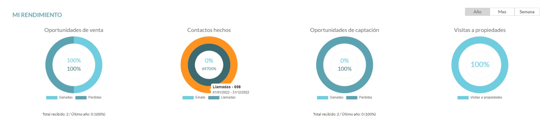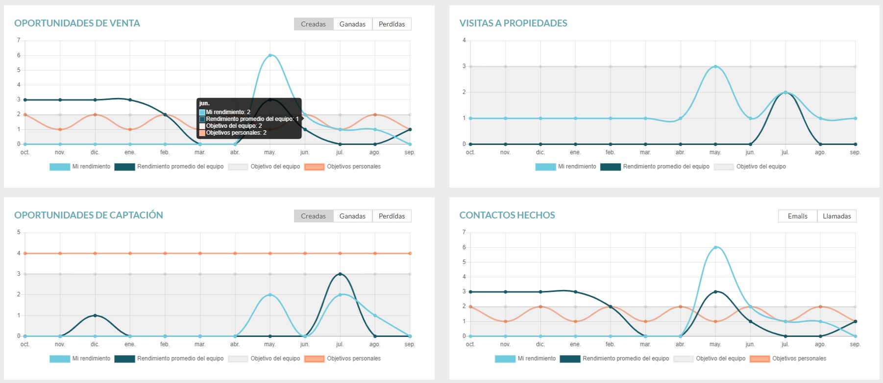 Compara el rendimiento del usuario/equipo durante dos períodos de tiempo en cuatro objetivos diferentes: oportunidades de venta, contactos realizados, oportunidades de prospección y visitas a propiedades realizadas.