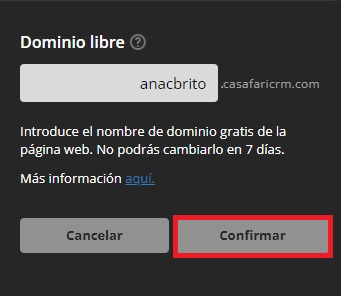 En el momento en que confirmes el dominio del sitio web en CRM, no podrás cambiarlo dentro de los próximos 7 días.