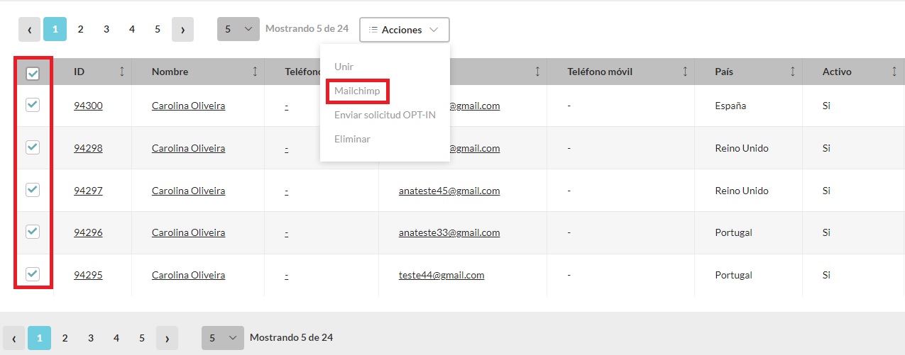 2. Seleccione los contactos, haz clic en "Acciones" y elige la opción "MailChimp".