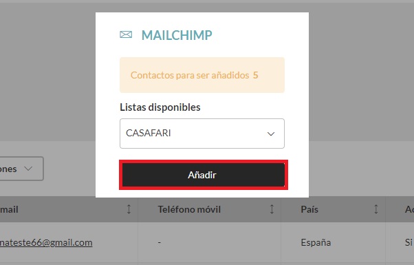3. Elige la lista y haz clic en "Añadir" para añadir los contactos a la lista de Mailchimp.