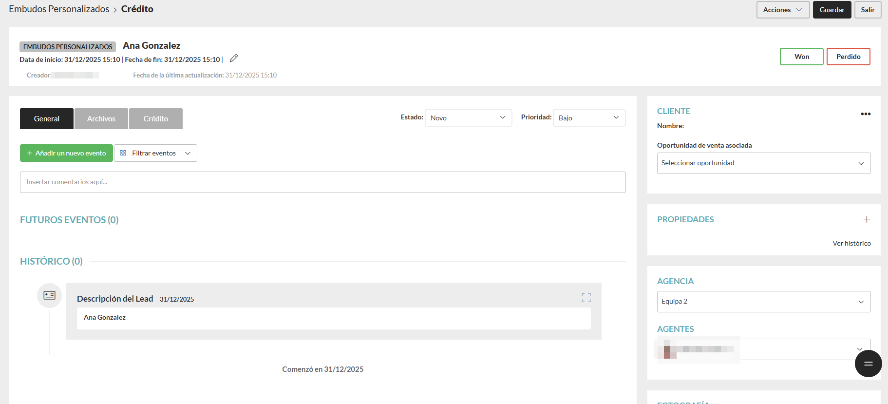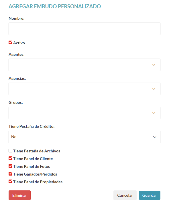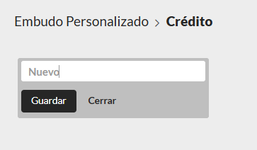 Para clientes con el Módulo de Crédito activado, también es posible crear embudos de crédito, con formularios y acciones específicas; basta con seleccionar “Sí” en el campo “¿Es embudo de crédito?”.