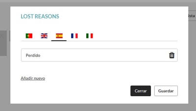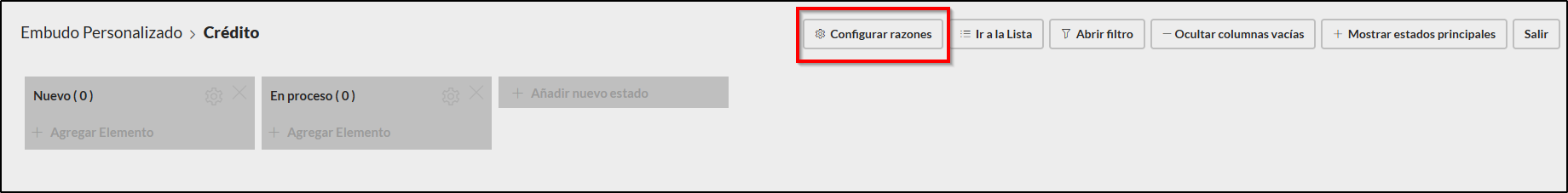 En la página de estados del embudo, es posible configurar los motivos de pérdida de una oportunidad haciendo clic en “Configurar razones”.