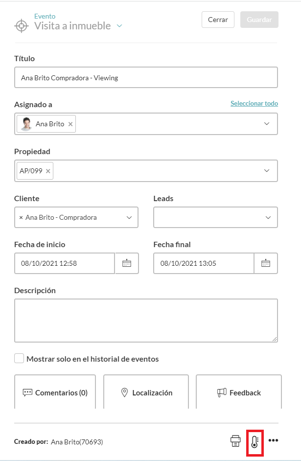 2. Elige un evento del tipo “Visita a Inmueble” y comprueba el estado del Termómetro: