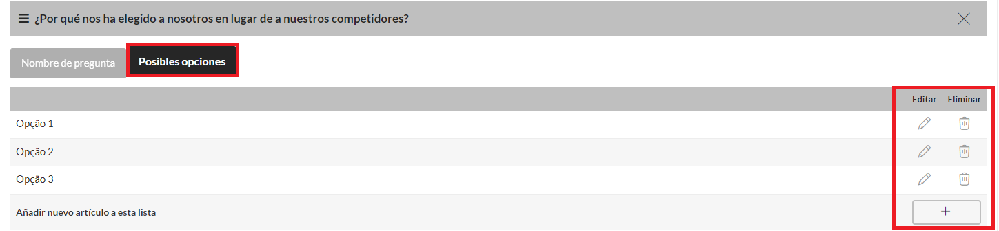 Nota: Para cada pregunta, indique si es obligatorio responderla. En el controle "Opciones" , establece las posibilidades de respuesta.