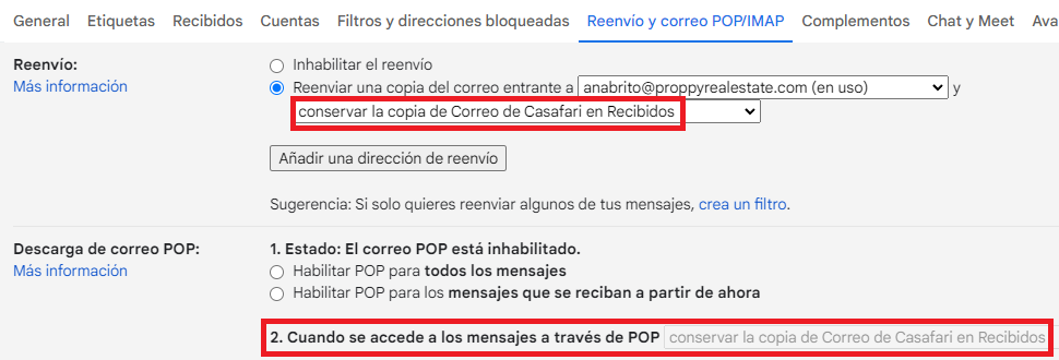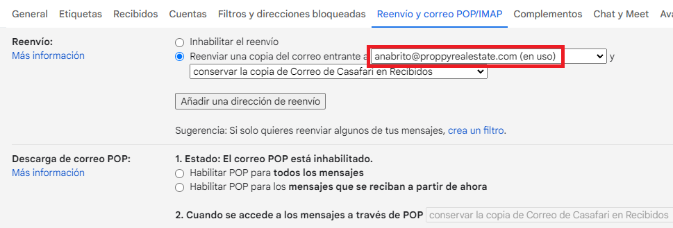 i. En Gmail, ve a Configuración- Ver todas las configuraciones - Reenvío y POP/IMAP - Reenviar una copia del correo electrónico a: