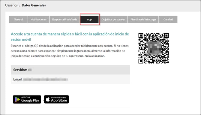 3. En la pestaña "APP” aparecerán dos opciones para iniciar sesión: