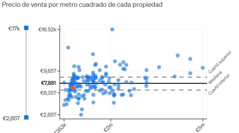 Al ver la sección Gráficos en una página de propiedades en CASAFARI, es importante comprender cómo se representa visualmente la propiedad específica que está analizando dentro de los datos generales del mercado.