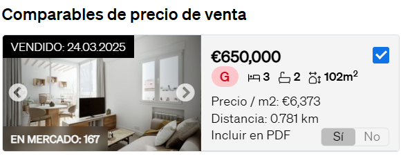 Al revisar su lista de comparables en la herramienta CMA de CASAFARI, las propiedades vendidas se diferencian visualmente por color para ayudar a identificar rápidamente el tipo de datos disponibles.