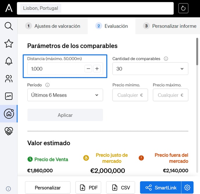 - En el segundo paso de la valoración, aumente la distancia de búsqueda en las configuraciones comparables (hasta 50.000 metros) para ampliar su área de búsqueda.