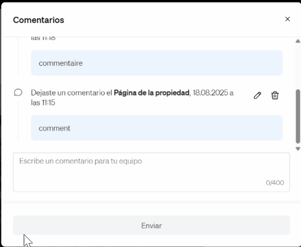 - Seleccione la sección “Comentarios” en la parte superior de la página de la propiedad junto a las opciones de generación de enlace inteligente y PDF.