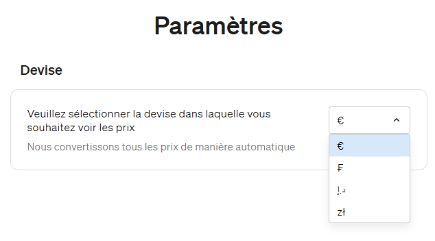 - Cliquez sur la devise actuelle pour ouvrir la liste des devises disponibles.