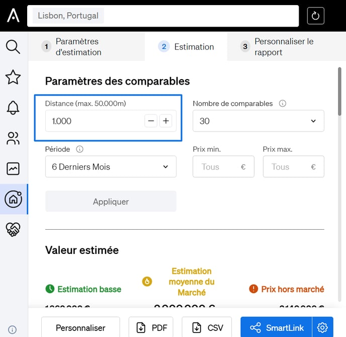 - Dans la deuxième étape de l’évaluation, augmentez la distance de recherche dans les paramètres comparables (jusqu’à 50 000 mètres) pour élargir votre zone de recherche.
