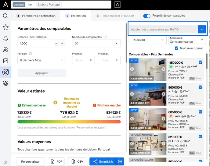 - Utilisez la barre de recherche au-dessus de la colonne comparable pour saisir la référence de la propriété et l'inclure dans votre analyse.