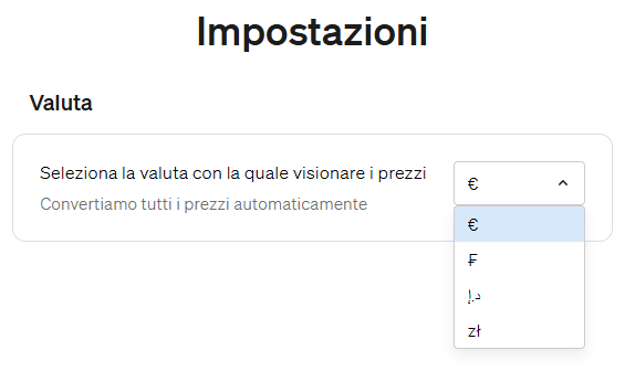 - Tutti i prezzi e i report degli immobili verranno automaticamente convertiti nella valuta appena selezionata.