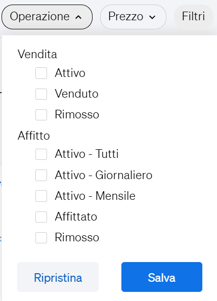 - Clicca sui filtri per selezionarne lo stato e l'attività, se è in affitto o in vendita, se è stato venduto, se è ancora attivo o se è stato rimosso dalla lista.