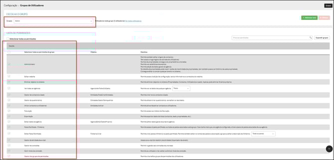 3. Veja a lista de permissões e selecione as que ficarão associadas ao grupo: