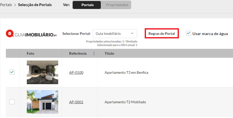 1. Aceda a Propriedades - Exportação para Portais - Seleção de Portais.