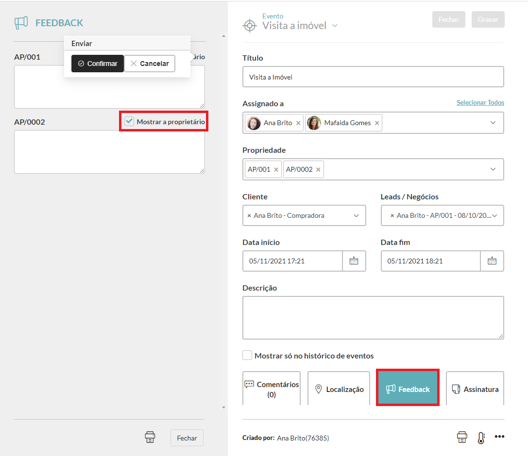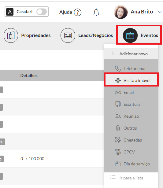 Gestão de visitas no CASAFARI CRM no desktop: