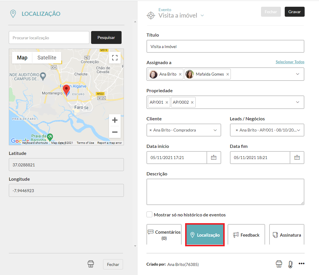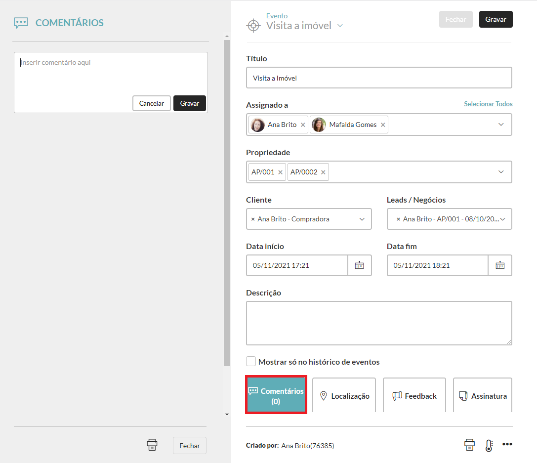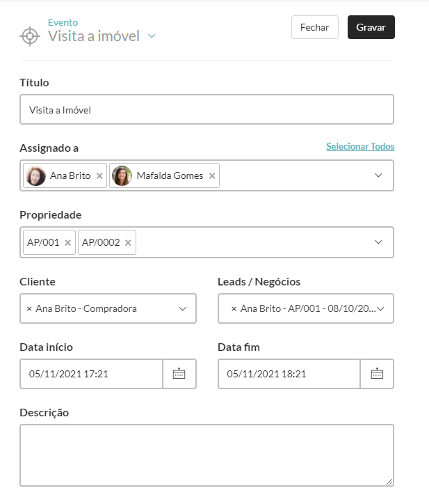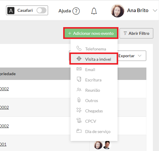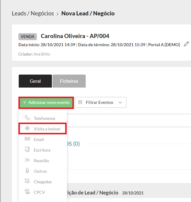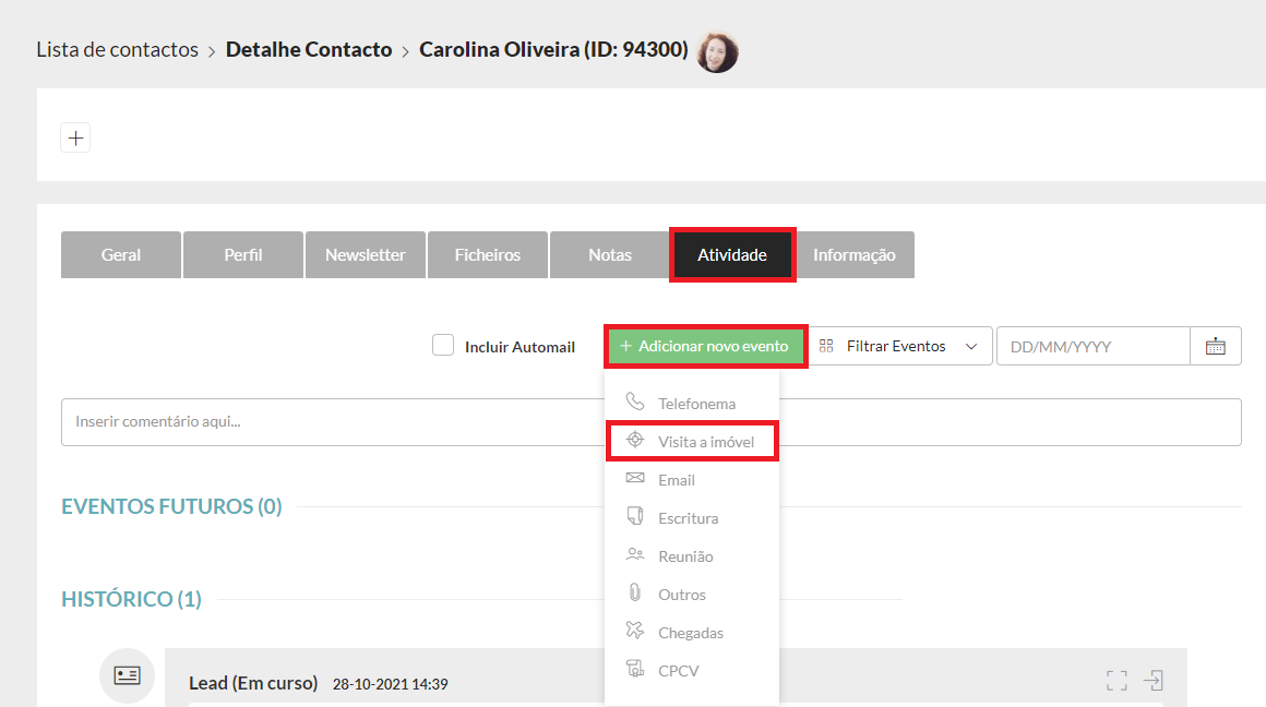 3. No separador “Atividade”, clique em “Adicionar novo evento” e escolha “Visita a Imóvel”.