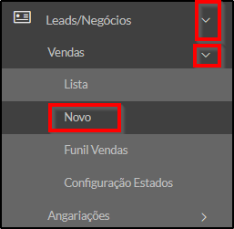 - Lead de venda: Clique em Leads/Negócios>Vendas>Novo
