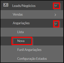 - Lead de angariação: Clique em Leads/Negócios>Angariações>Nova