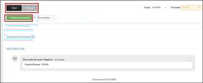 Dentro da lead, pode acrescentar ficheiros e em geral pode acrescentar comentários e os seguintes tipos de eventos: