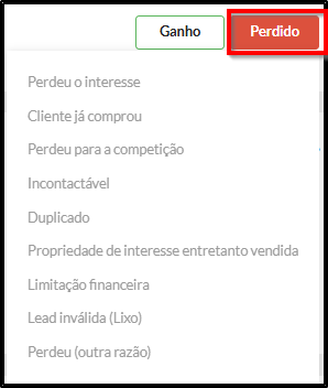 - Para fechar uma lead basta selecionar "Ganho" ou "Perdido".