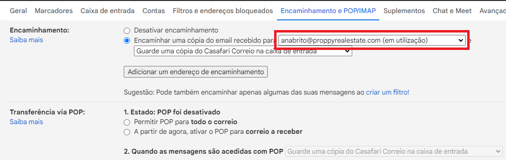i. No Gmail, aceda a Definições- Ver todas as definições - Encaminhamento e POP/IMAP - Encaminhar uma cópia do e-mail para: