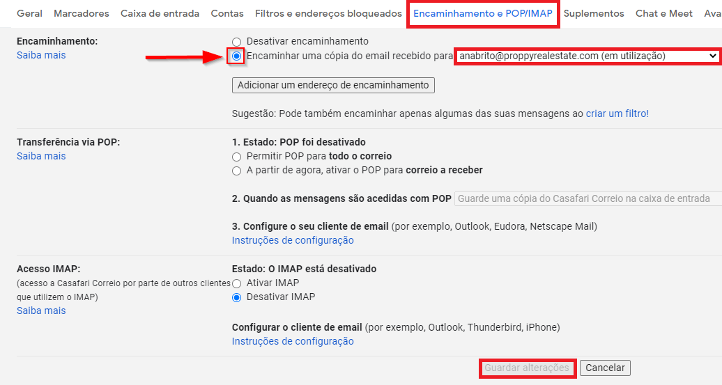 i. No Gmail, em Definições - Ver todas as definições - Encaminhamento e POP/IMAP - Encaminhamento: