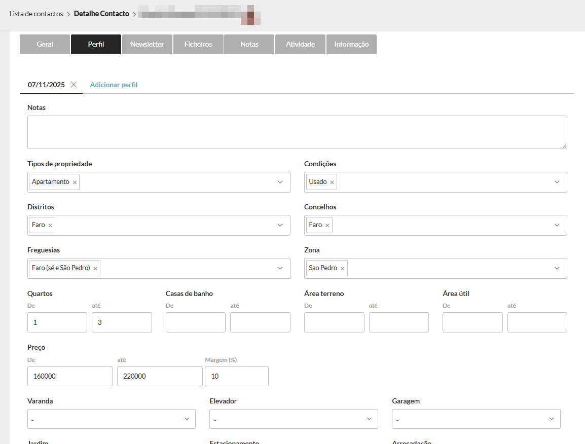 1. Aceda ao detalhe do comprador, na área de Contactos e clique no separador Perfil.