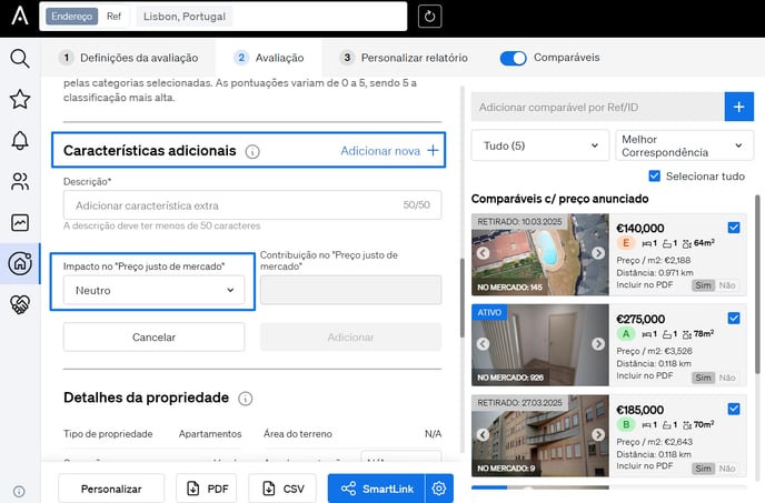 Se a sua propriedade tiver uma característica específica que possa influenciar o seu valor, como painéis solares, uma cozinha renovada ou áreas que necessitem de melhorias, a CASAFARI permite-lhe adicioná-lo manualmente à sua avaliação.